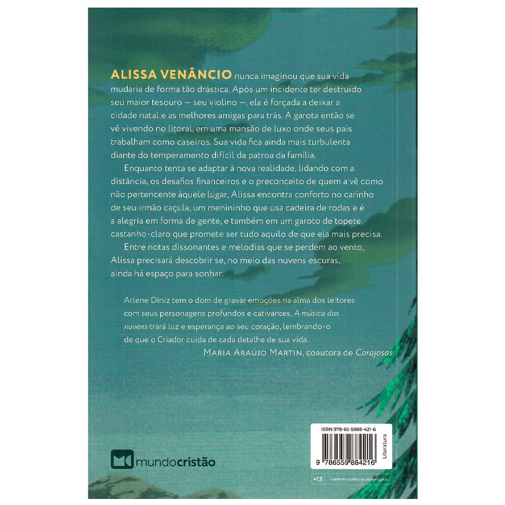 Entre notas dissonantes e melodias que se perdem ao vento, Alissa precisará descobrir se, no meio das nuvens escuras, ainda há espaço para sonhar. Arlene Diniz tem o dom de gravar emoções na alma dos leitores com seus personagens profundos e cativantes. Amúsica das nuvens trará luz e esperança ao seu coração, lembrando-o de que o Criador cuida de cada detalhe de sua vida.