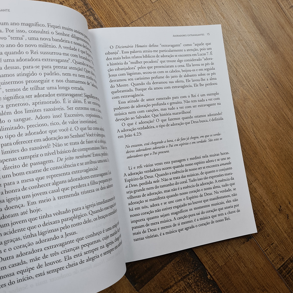 Adoração Extravagante não é um livro que se resume a músicas ou canções, mas de devoção ao Salvador. Página por página, seremos levados a refletir sobre o nosso relacionamento com Deus, de forma a enxergar se estamos ou não nos prostrando, se estamos ou não nos entregando e aceitando seu poder no guia de nosso viver.