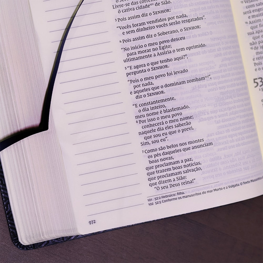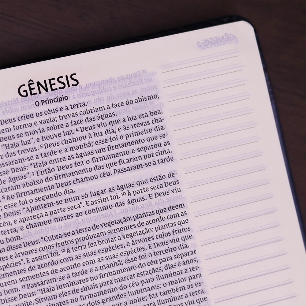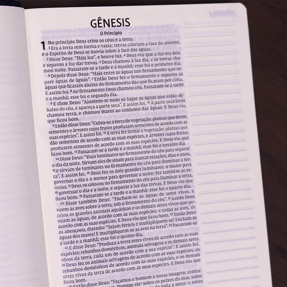 Quantas vezes estamos na igreja e ouvimos algo tão tocante que queremos registrar, mas não podemos porque não temos onde anotar? Você até gostaria de escrever na própria Bíblia, para que aquela informação complementasse seus estudos bíblicos, mas ela não tem espaço. Esta Bíblia chegou para resolver esse problema. Pensada para você que gosta de registrar comentários e anotações que enriqueçam a compreensão do texto bíblico, Sua Bíblia foi elaborada, agora em letra grande e com textos dispostos em coluna única, para incluir anotações sem prejudicar a leitura das Escrituras. Com papel diferenciado que dá mais destaque às suas anotações e mais visibilidade ao texto, graças à fonte Leitura Perfeita, especialmente desenvolvida pela Thomas Nelson Brasil, esta é a ferramenta ideal para aqueles que desejam aprofundar seu relacionamento com a Palavra.| Título: | Bíblia Sagrada - Leitura Perfeita |