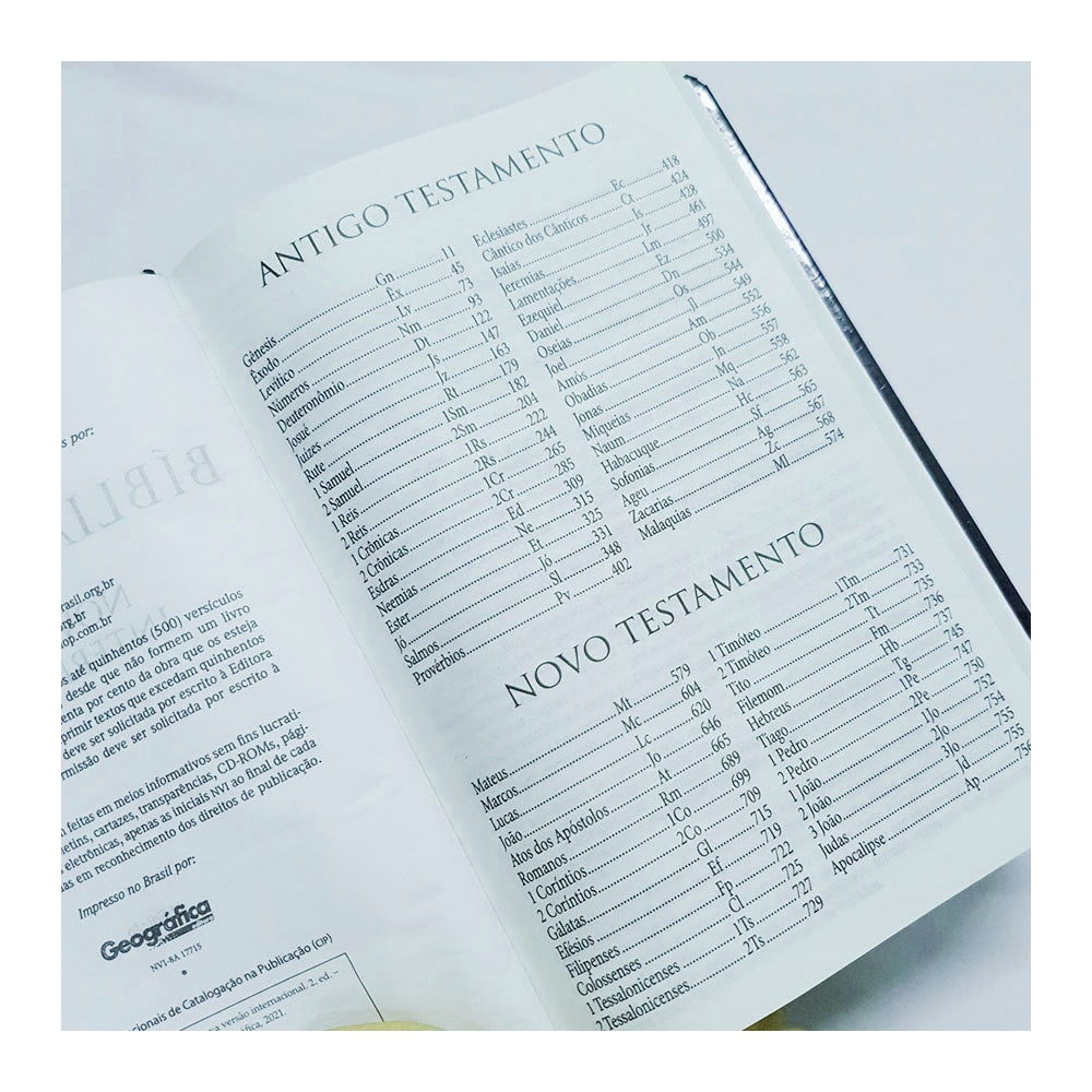 Bíblia Sagrada, com a linguagem na versão NVI (Nova Versão Internacional). Dentre as versões da bíblia ela se torna uma das mais modernas e preservando a clareza do texto, permanecendo fiel aos Escritos originais. Incluindo panorama bíblico e mapas, uma exclusividade Plenitude Distribuidora.
