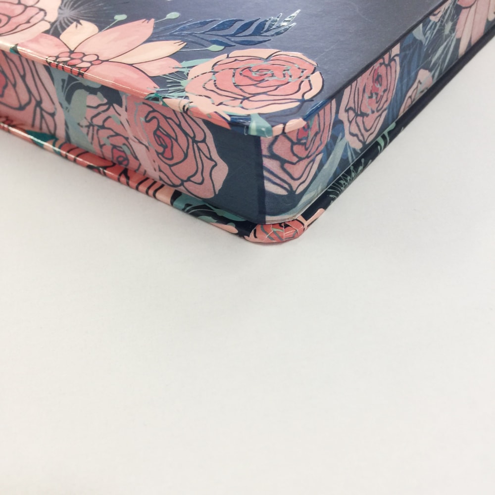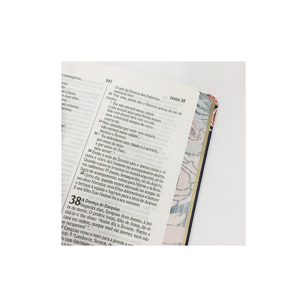 Capa dura ilustrada com flores na capa e bordas com antigo e novo testamento.