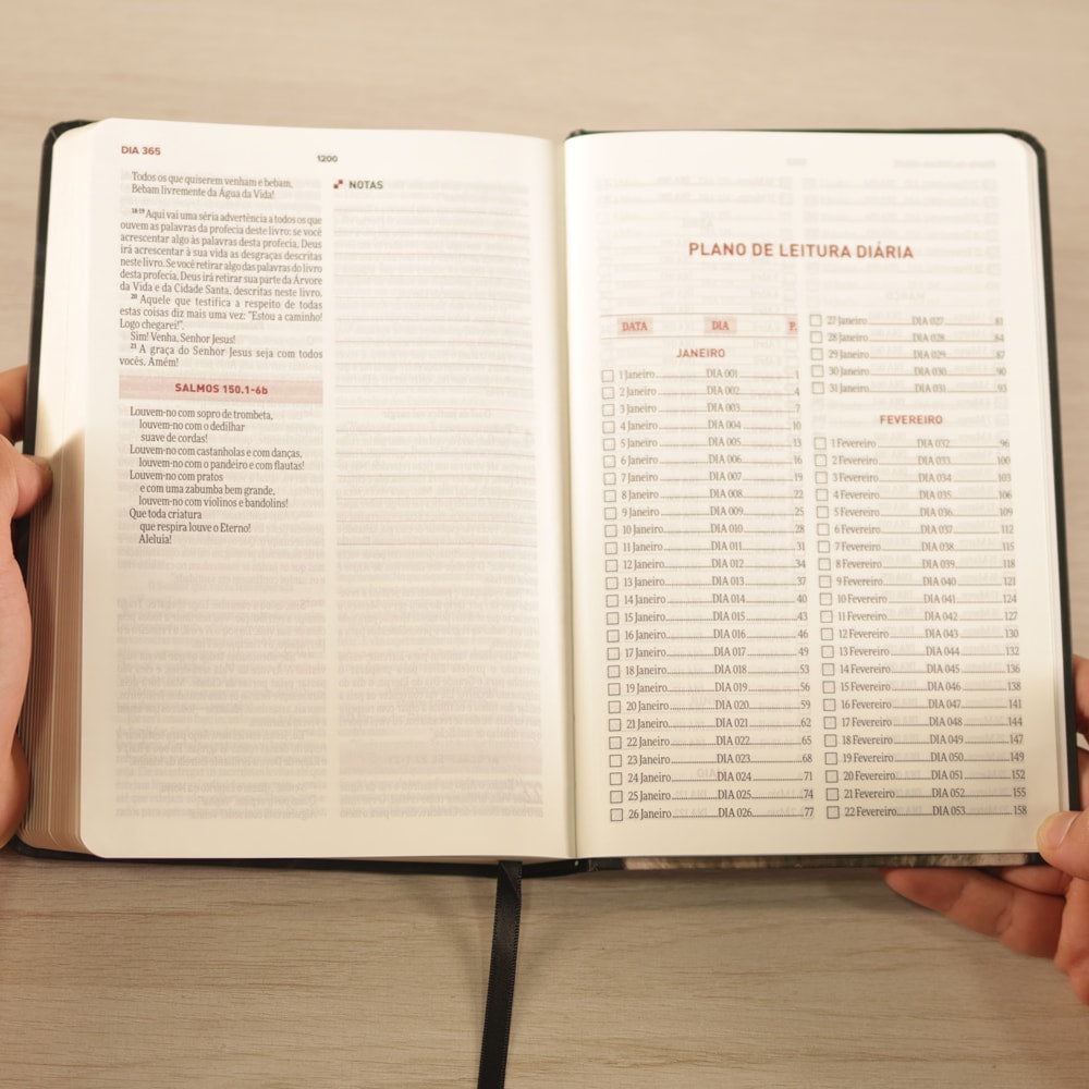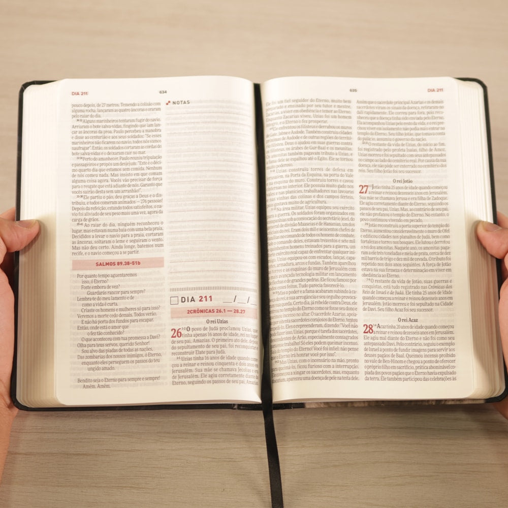 Para cada dia, você encontrará trechos cuidadosamente selecionados do Antigo Testamento, Novo Testamento e Salmos, além de um espaço dedicado para anotações ou expressões criativas. Essa experiência te auxiliará na rotina diária de leitura Bíblica.