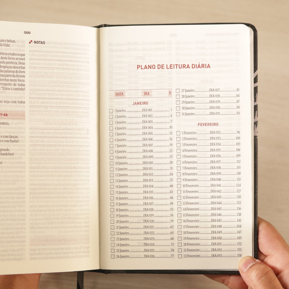 Para cada dia, você encontrará trechos cuidadosamente selecionados do Antigo Testamento, Novo Testamento e Salmos, além de um espaço dedicado para anotações ou expressões criativas. Essa experiência te auxiliará na rotina diária de leitura Bíblica.