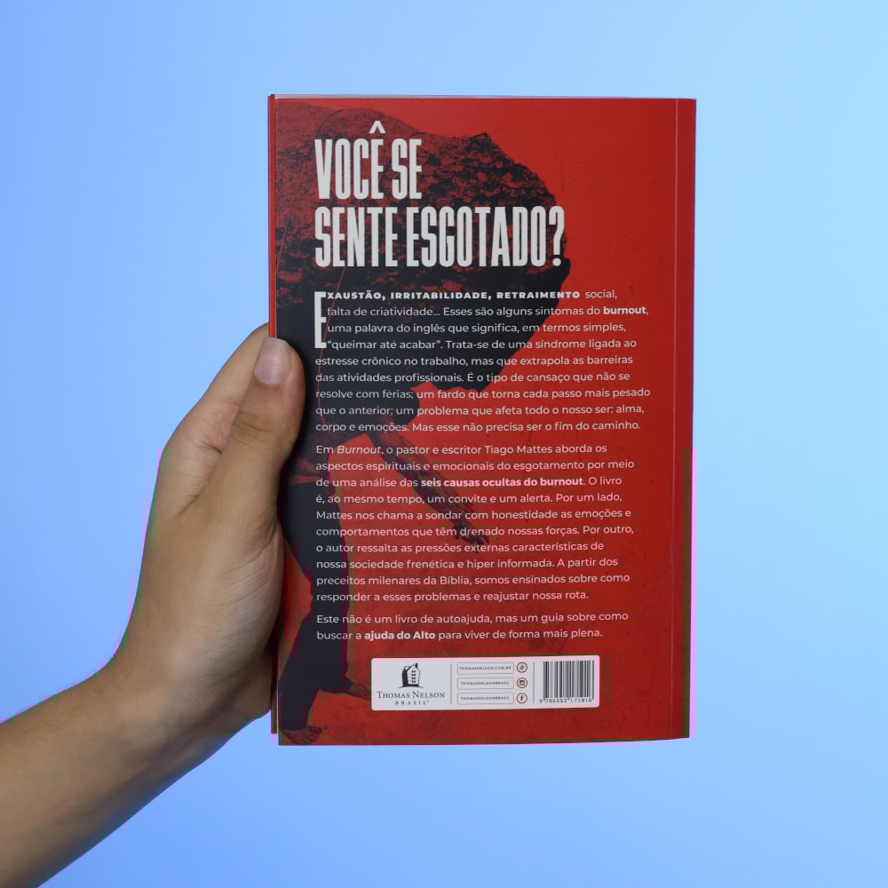 Em Burnout, o pastor e escritor Tiago Mattes explora as causas espirituais e emocionais desse esgotamento, oferecendo uma análise das seis causas ocultas do burnout. O livro é um convite a examinar honestamente suas emoções e comportamentos, enquanto alerta sobre as pressões de nossa sociedade acelerada.