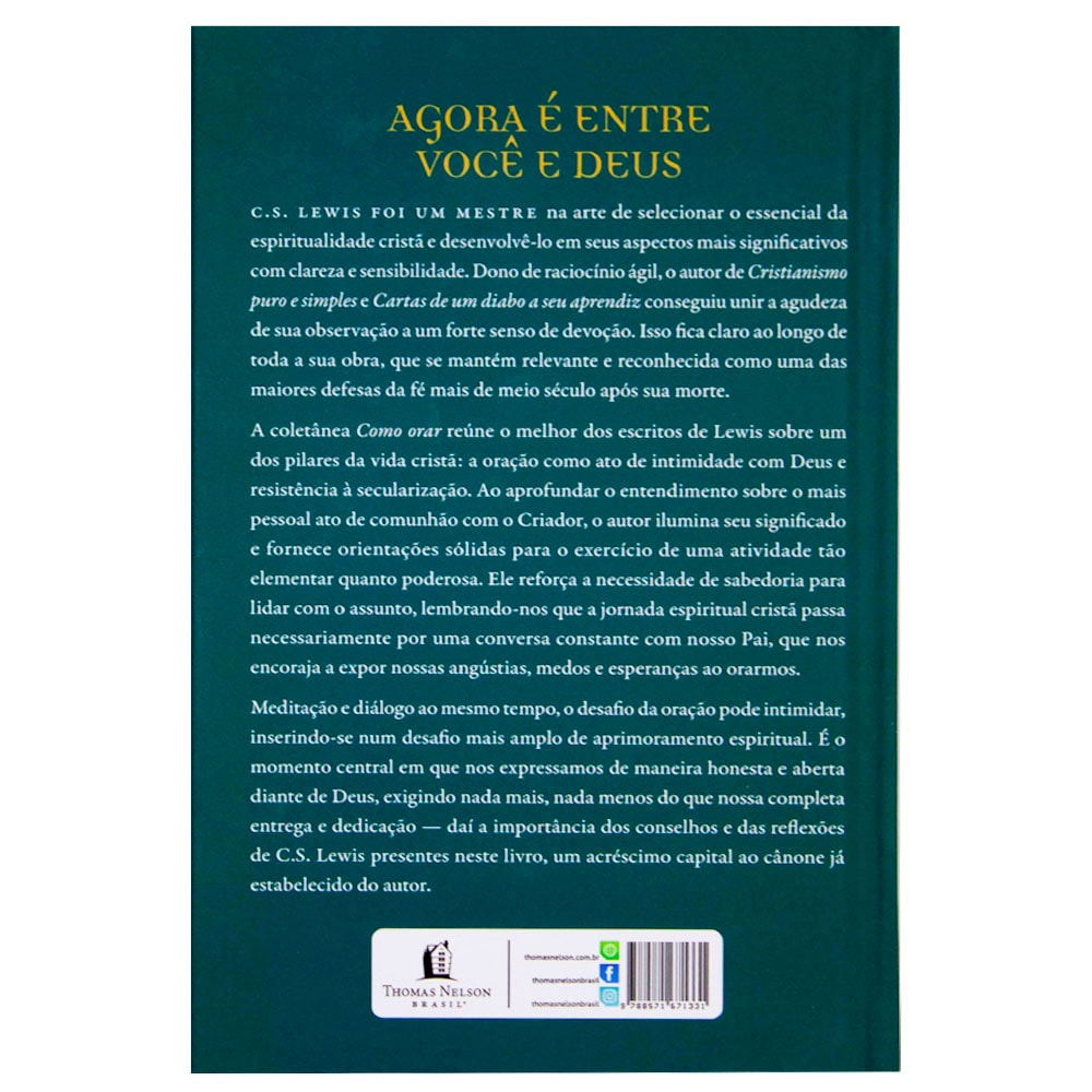 Nessa nova coletânea vinda de mais uma de suas escritas, C. S. Lewis nos fornece um rico conhecimento que trarão vida e direção para com a nossa vida com Deus e em nosso diálogo com O Criador, muitas pessoas almejam ter um relacionamento melhor com Deus e desenvolver assim um relacionamento com Deus, mas é fato que na realidade parece ser algo muito distante e não sabem como começar.