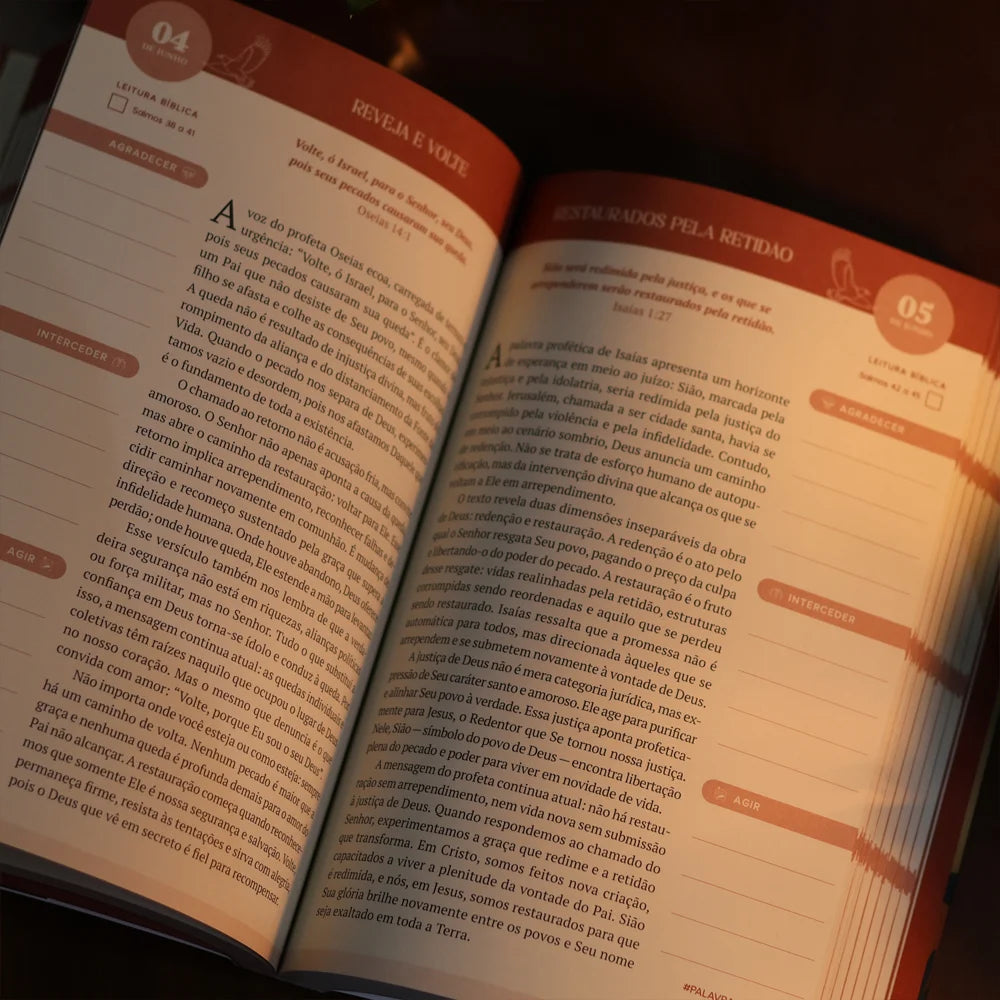 Cada dia oferece uma meditação cuidadosamente preparada para confrontar, restaurar e fortalecer sua fé, unindo denúncias contra injustiças a promessas divinas de esperança e redenção. Com espaços para anotações de gratidão, intercessão e ações práticas — incluindo o dia 29 de fevereiro —, esta obra torna seu momento devocional uma experiência interativa e profundamente transformadora.