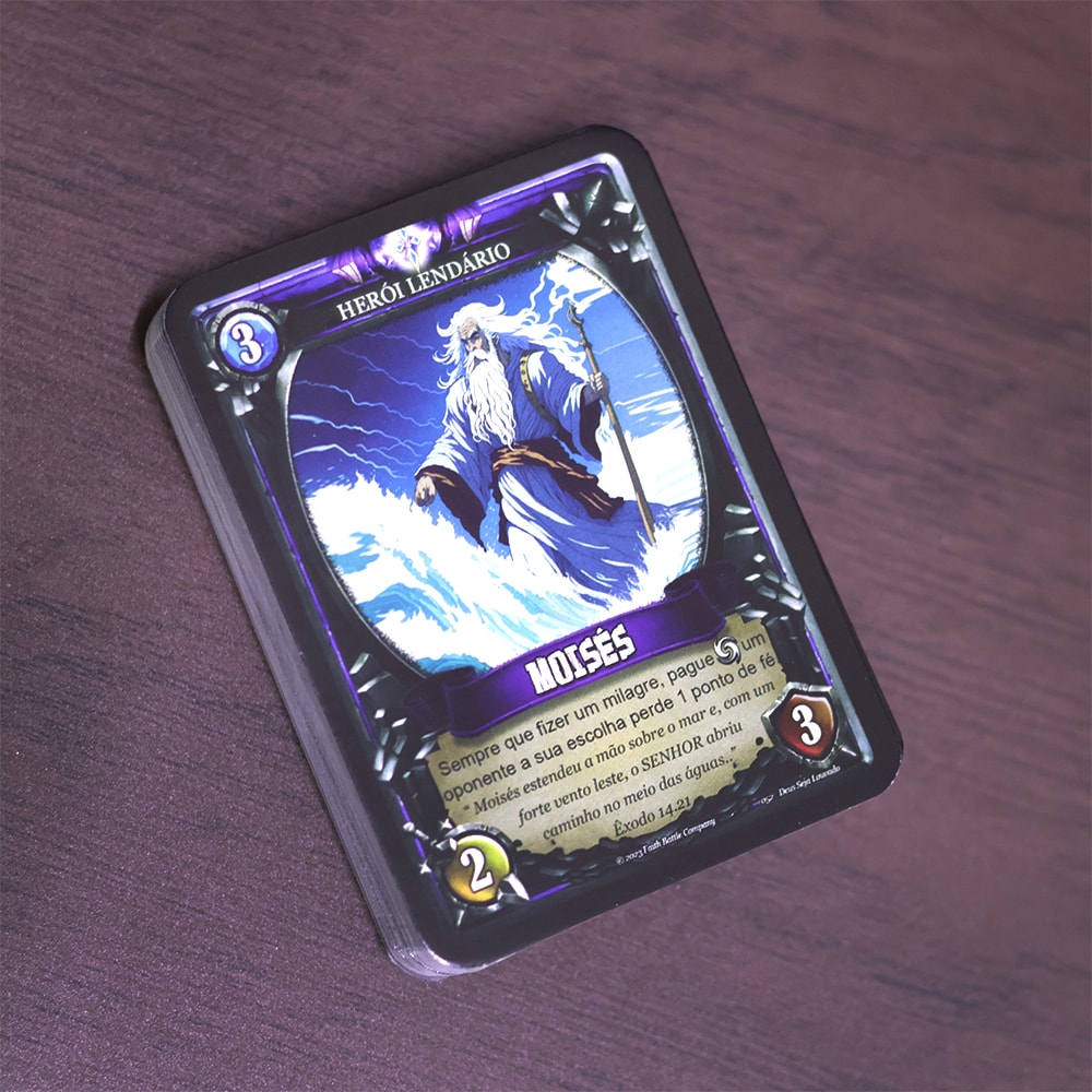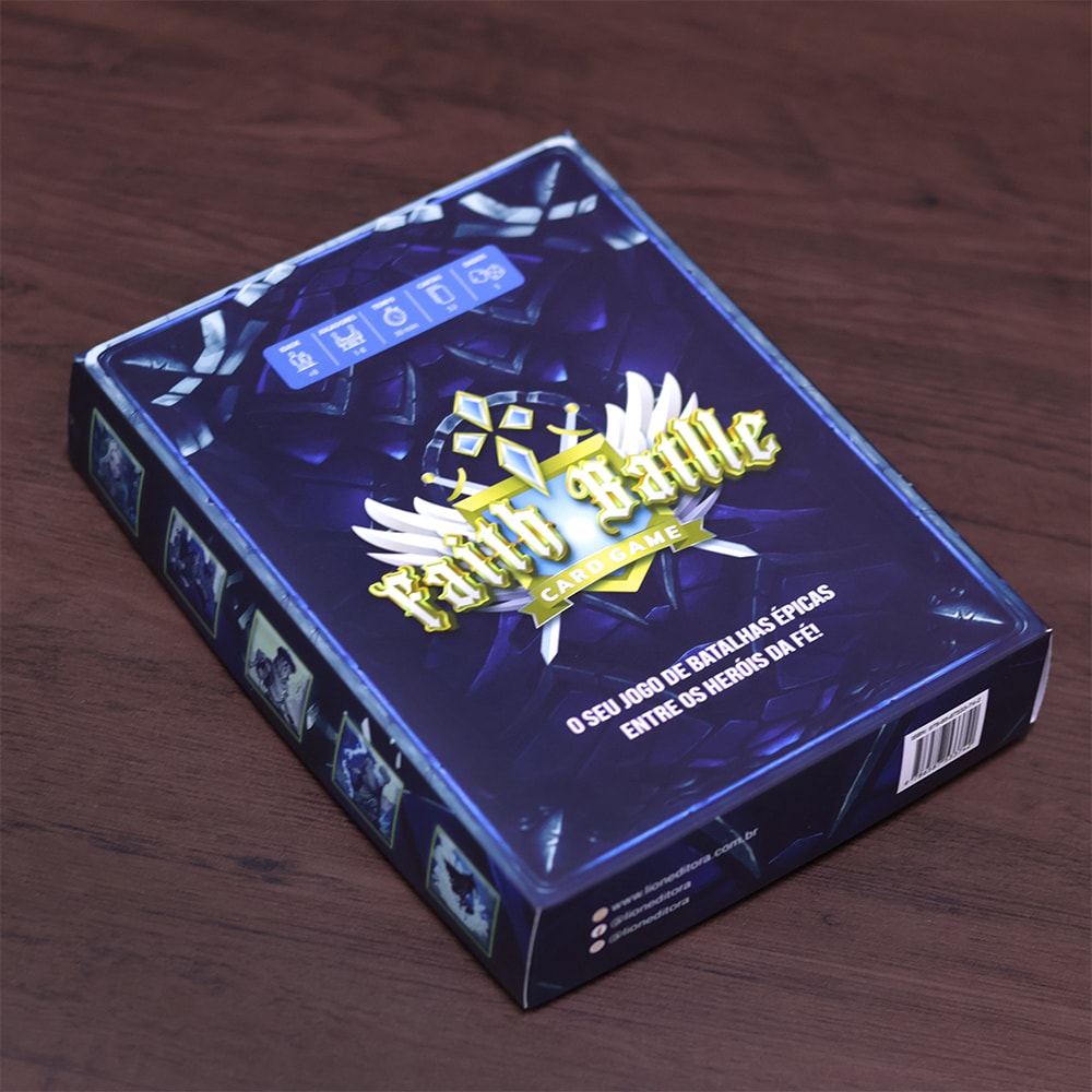 Faith Battle - o primeiro jogo de cartas colecionáveis bíblico no mundo! Nele o jogador precisa sobreviver a uma batalha contra seus oponentes, usando a melhor estratégia com pontos de sabedoria acumulados e as cartas em sua mão. As cartas mostram de personagens à situações bíblicas, divididas em seis categorias: Heróis, Artefatos, Milagres, Pecados, Lendárias e Cartas de Sabedoria. Cada categoria tem seus efeitos e habilidades únicas, que personalizam a estratégia das jogadas. Faith Battle é composto por um deck individual composto por 53 cartas, cinco dados e um campo de jogo. Importante: ainda que cada partida possa comportar até oito jogadores, cada um deles deve possuir seu próprio jogo. Para deixar a batalha ainda mais emocionante, os jogadores podem colecionar decks do Faith Battle: quanto mais cartas cada jogador tiver individualmente, maiores as possibilidades da partida! Dinâmico e versáti!