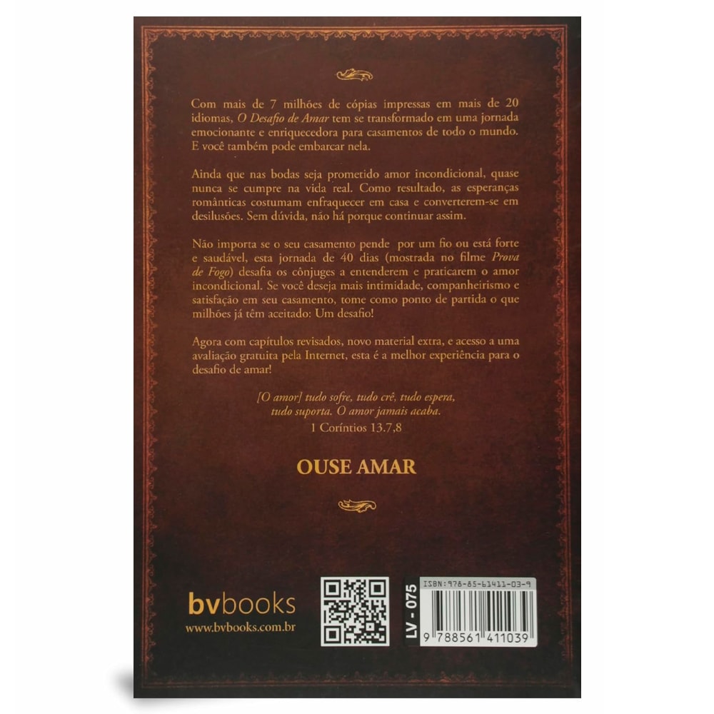 Citado no filme Prova de Fogo, o livro O Desafio de Amar é uma experiência devocional de 40 dias para maridos e esposas que desejam entender o amor incondicional independente de como esteja o seu casamento. O Desafio de Amar é ideal para ministérios de casais, para presentar seu amigo casado ou até mesmo para usar como uma ferramenta importante para renovação do seu casamento. Ameaçado ou saudável, O Desafio de Amar é uma estrada que precisa ser seguida. É hora de descobrir os segredos de um casamento cheio de vida e da verdadeira intimidade. Este livro é citado dentro do filme Prova de Fogo (dos mesmos produtores de Desafiando os Gigantes). O livro não é a trama do filme em si, é apenas um dos recursos usados por um dos personagens do filme - que agora poderá também ser um recurso para você usar em sua vida ou no ministério de casais de sua igreja. Conforme proposto no filme, o livro O Desafio de Amar é feito em forma de um diário, onde durante 40 dias você encontra um devocional diário e um desafio específico para aquele dia. Todas as leituras incluem as Escrituras, um ""desafio"" do dia e um espaço para anotação e verificação do progresso. Desafie-se a aceitar o desafio de amar e veja o seu casamento ser transformado para sempre.Título: | O Desafio de Amar |