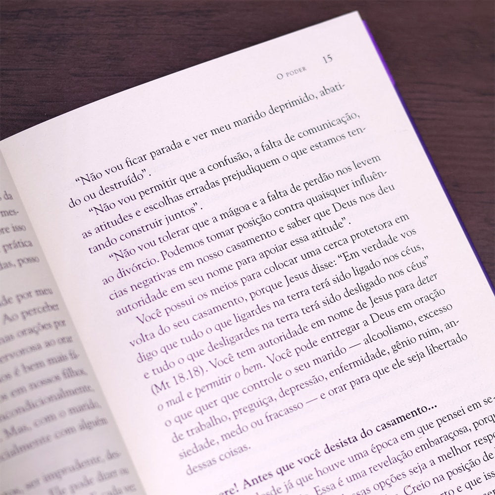 No livro, a autora compartilha sua experiência acerca de como aprofundar o relacionamento com o cônjuge a partir do poder da oração e a como utilizar essa arma espiritual em prol da harmonia no seio matrimonial