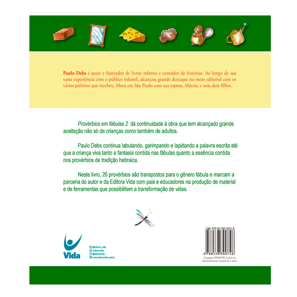 Provérbios em fábulas 2 dá continuidade à obra que tem alcançado grande aceitação não só de crianças como também de adultos. Paulo Debs continua labutando, garimpando e lapidando a palavra escrita até que a criança viva tanto a fantasia contida nas fábulas quanto a essência contida nos provérbios de tradição hebraica. Neste livro, 26 provérbios são transpostos para o gênero fábula e marcam a parceria do autor e da Editora Vida com pais e educadores na produção de material e de ferramentas que possibilitem a transformação de vidas.