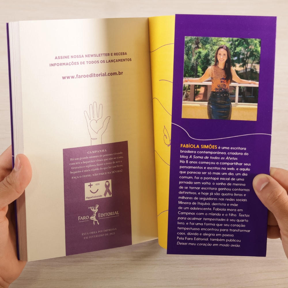 Com textos e poemas que equilibram leveza e profundidade, Fabíola constrói uma narrativa sensível e dinâmica que tem conquistado milhares de leitores. "Textos para Acalmar Tempestades" é uma obra que promete tocar o coração e inspirar aqueles que buscam compreender suas próprias tempestades interiores.